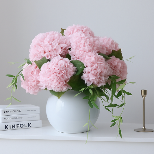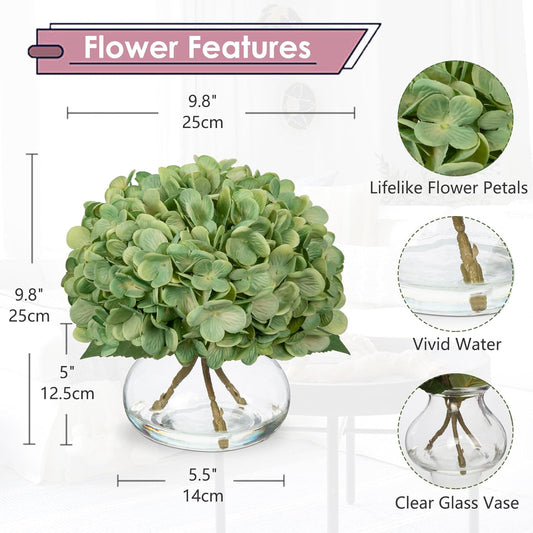 Faux Hydrangea Artificial Flowers with Glass Vase