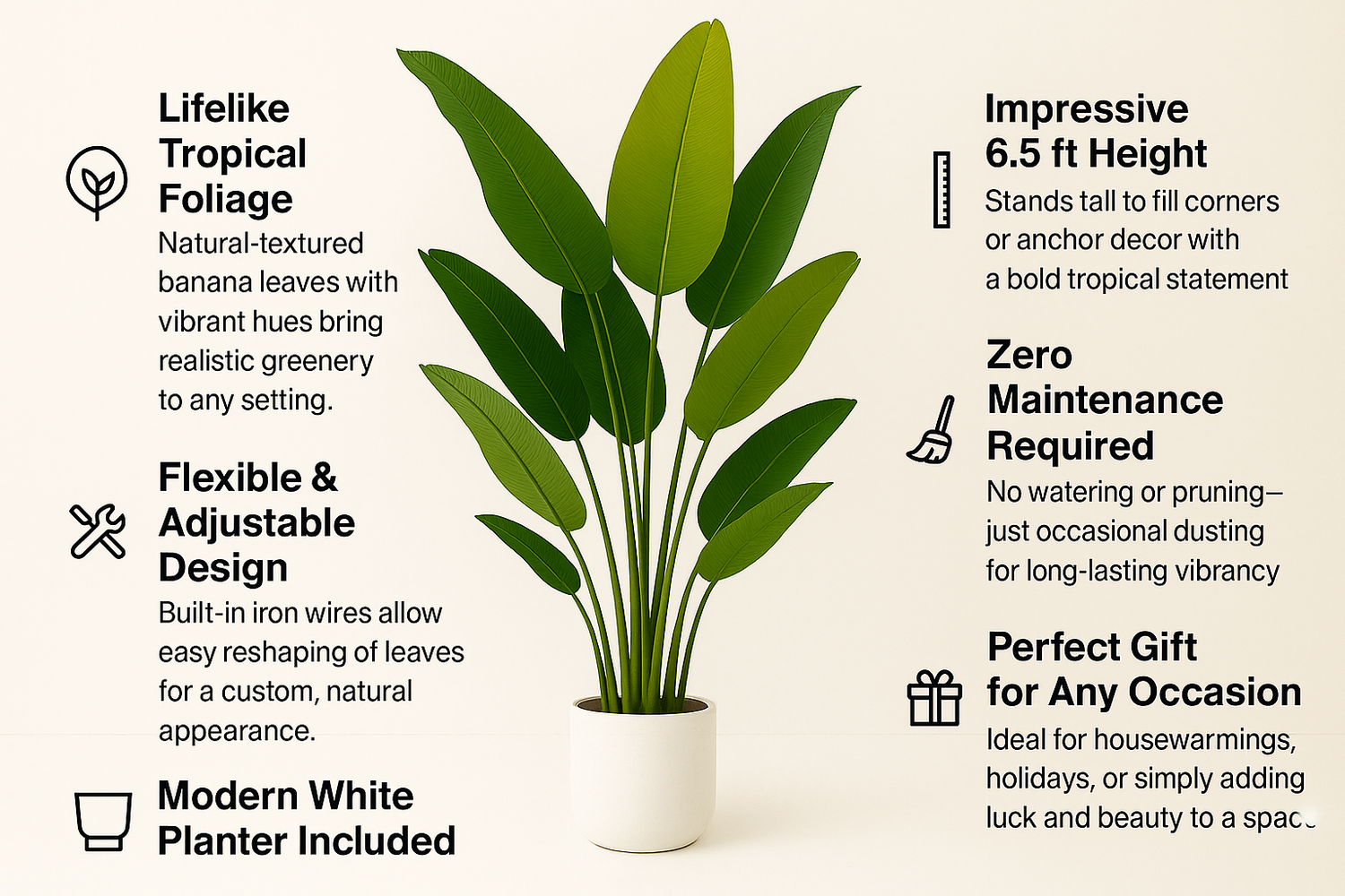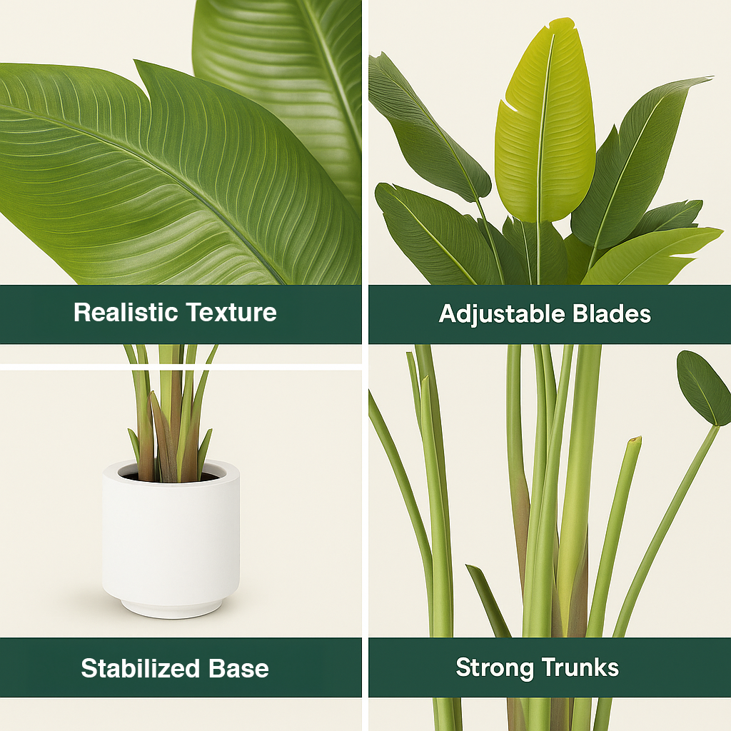 • Leaves: 15 large, ultra-realistic banana-style leaves
