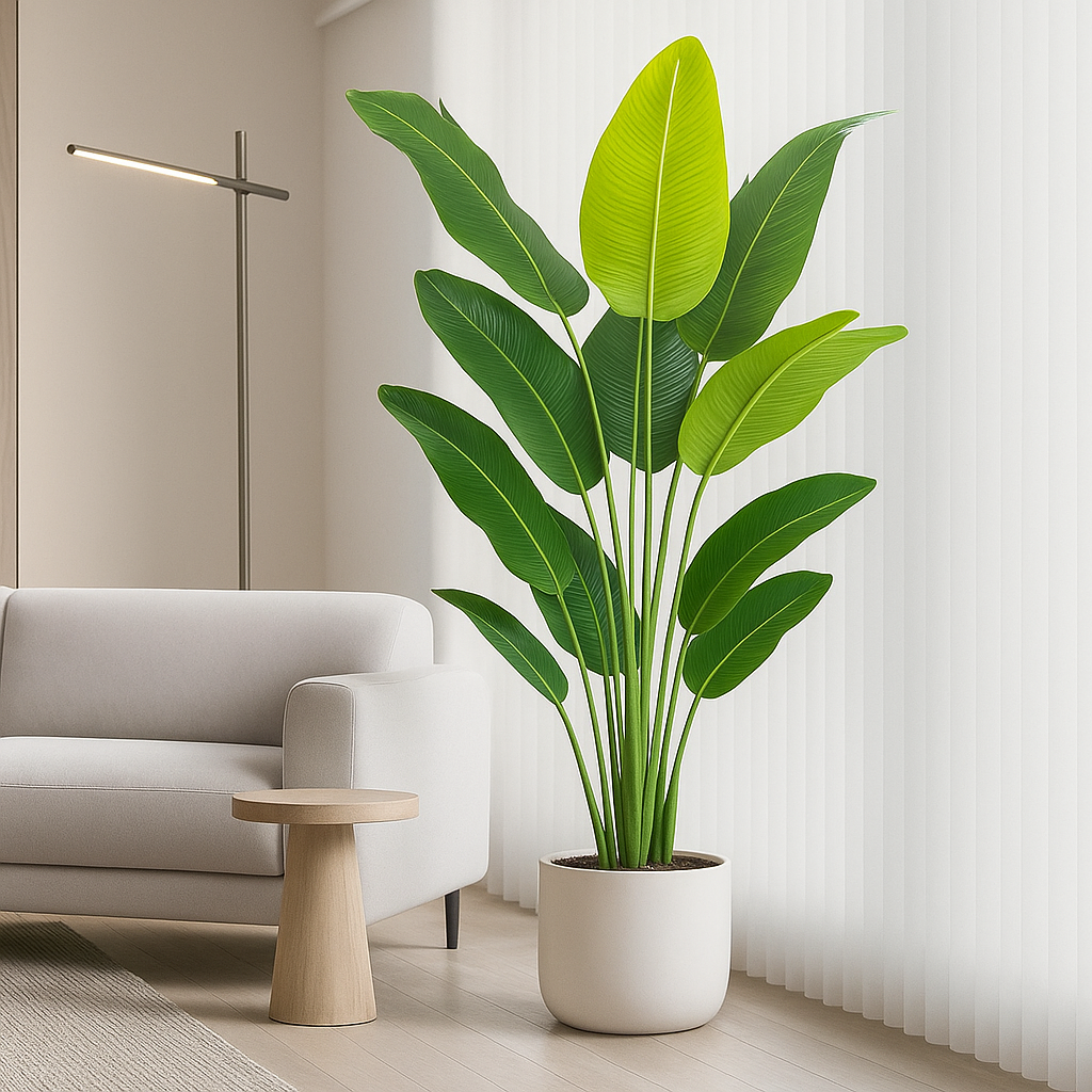 At 6.5 feet tall, this Bird of Paradise adds natural presence without taking over. Its slim profile and upright leaves make it perfect for tucking beside a sofa, framing an entryway, or elevating corners — bold enough to stand out, subtle enough to blend in.