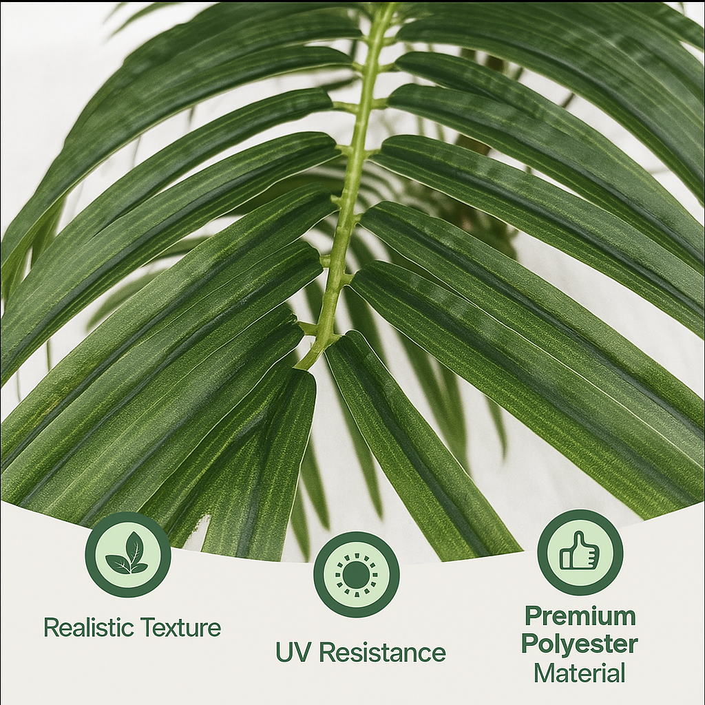 Transform your space into a tropical sanctuary with our 5.5ft Artificial Palm Tree. Crafted with attention to detail, this tree features 570 lifelike feather-like leaves and 15 smooth trunks, each meticulously made from premium polyester. The realistic tree bark, implemented with actual bark pieces, enhances its authentic appearance, ensuring it blends seamlessly into your decor.