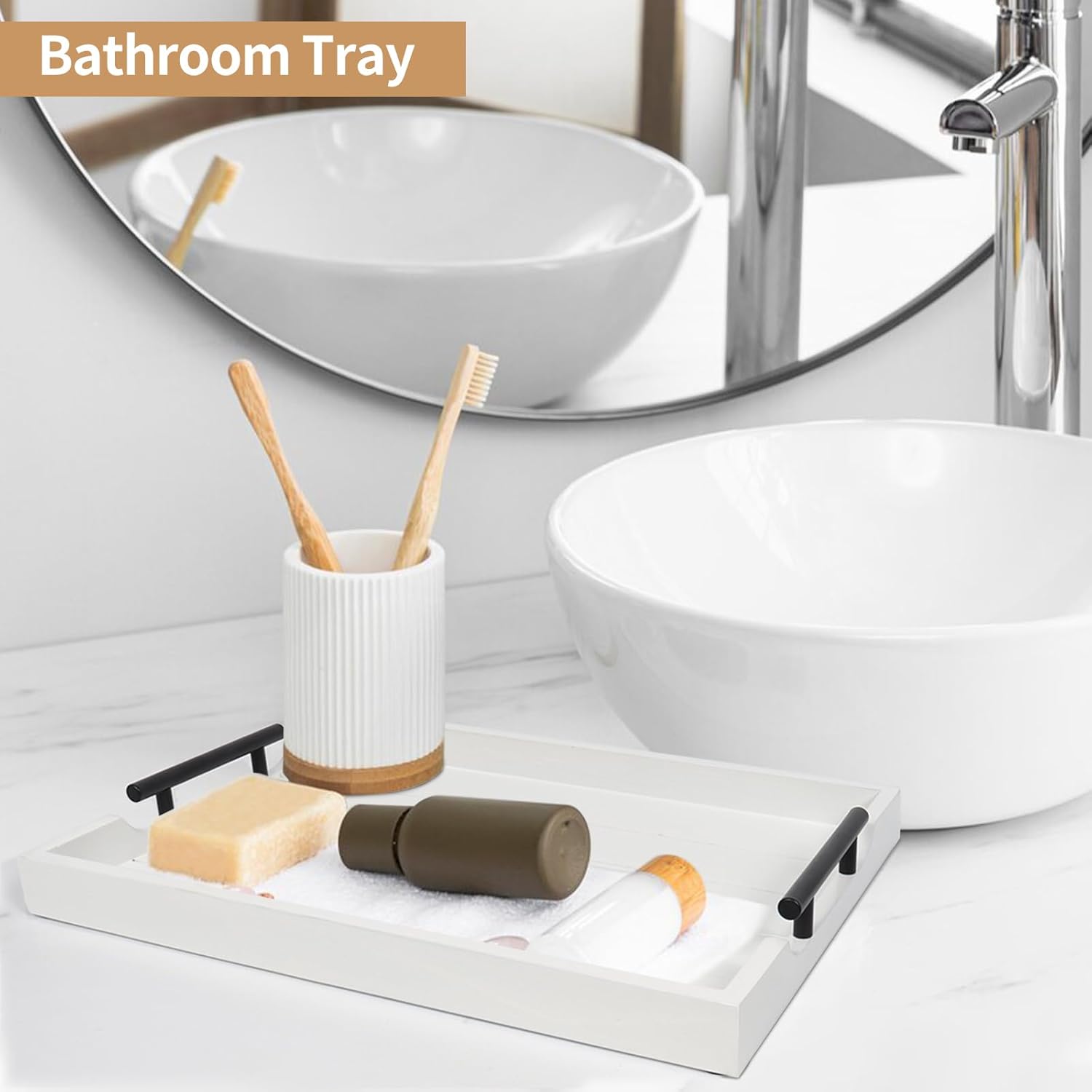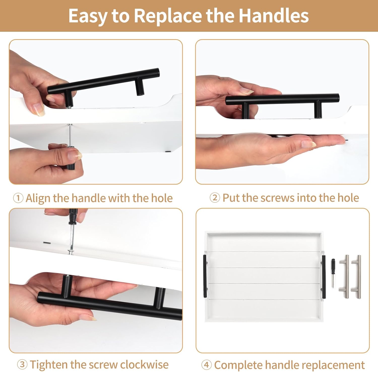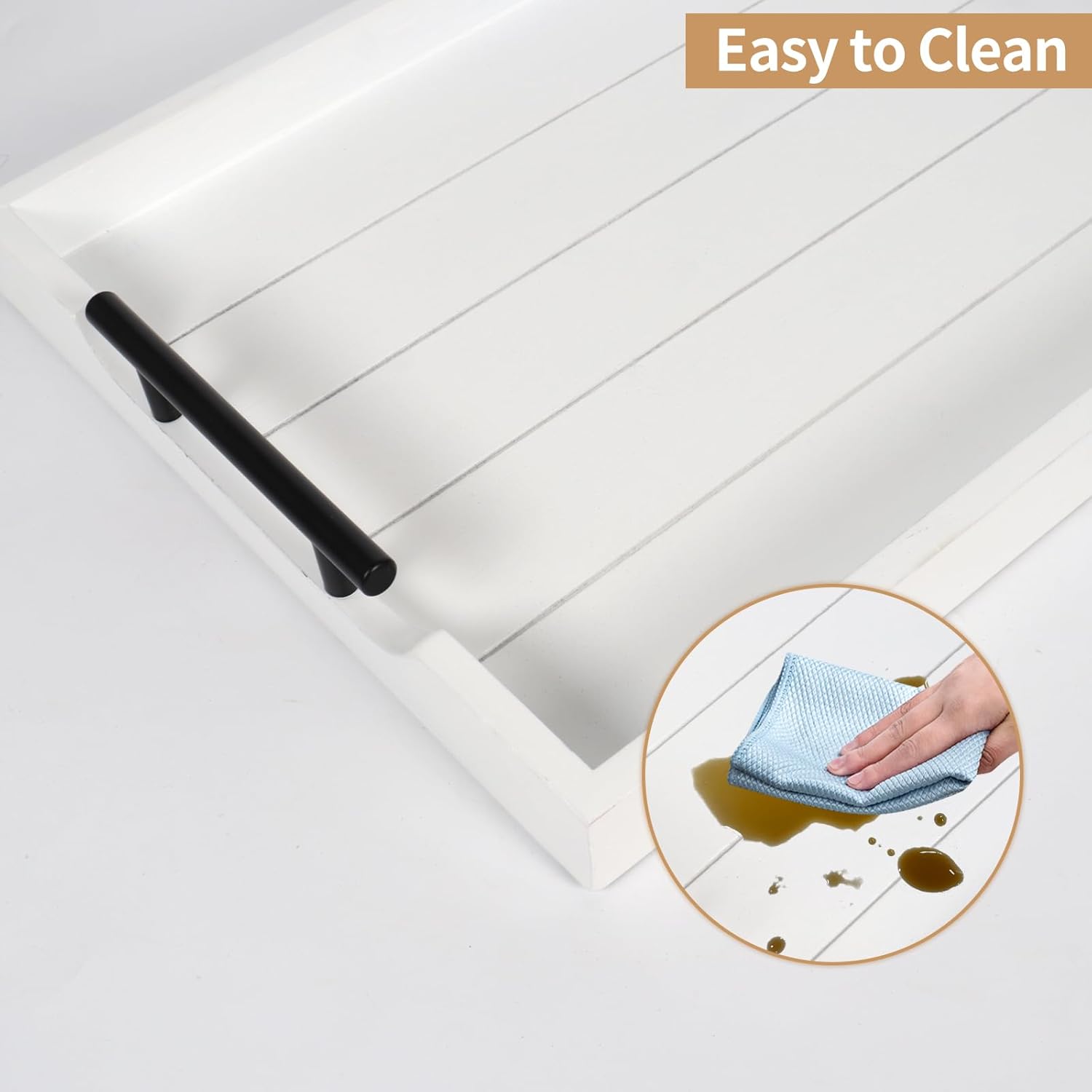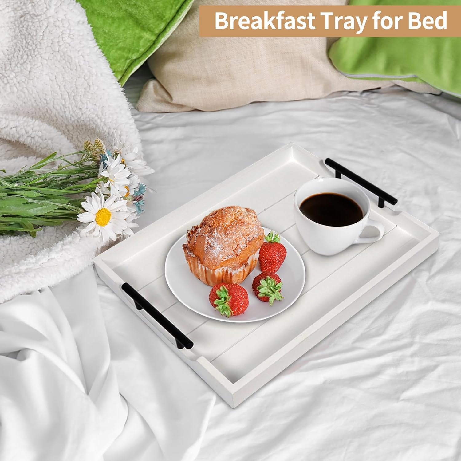 [【NATURAL RUSTIC YET STYLISH TRAY】What a large white wooden serving tray with handles you would get! Acted as a coffee table tray for serving snacks and dessert a large wood ottoman tray for breakfast and Modern Rustic Farmhouse Boho and Vintage home decor styles. "【SELECT YOUR HANDLE COLOR】Why not cost one money to get double happiness? Try our deluxe large white wooden tray for ottoman with 2 sets of metal handles. Now we offer two colors premium matte black and polished silver for replacement. Lets test your operational ability with the fantastic wood serving tray." "【WHO DOESNT LOVE HANDCRAFTS?】Have to say our rectangle white wood serving tray is so functional and stylish at the same time. Every paint process is completed by our hard workers who aim to make each beautiful tray to prevent splinters paint chips and scratches. Its lightweight but sturdy enough to be used as a coffee table tray for the living room." 【HOW THOUGHTFUL THE 4 COASTERS ARE】Do you often get this trouble of mess and stained tables? Bring Sxnows large wooden ottoman tray for living room with 4 natural wood round coasters no matter coffee table dinner table living room or outdoor garden always keep your furniture surfaces dry and clean. A sweet design is 4 cushions "feet" for non-slip and protection. "【ESSENTIAL CENTERPIECE FOR ALL SEASONS】Whether youre looking for white wooden serving trays for coffee table ottoman living room or kitchen counter rustic wooden trays for a dessert table or an impressive gift for someone who loves decorating home at Christmas Halloween Thanksgiving etc... Our unique white wooden serving tray with metal handles and wood coasters is an ideal choice."]
