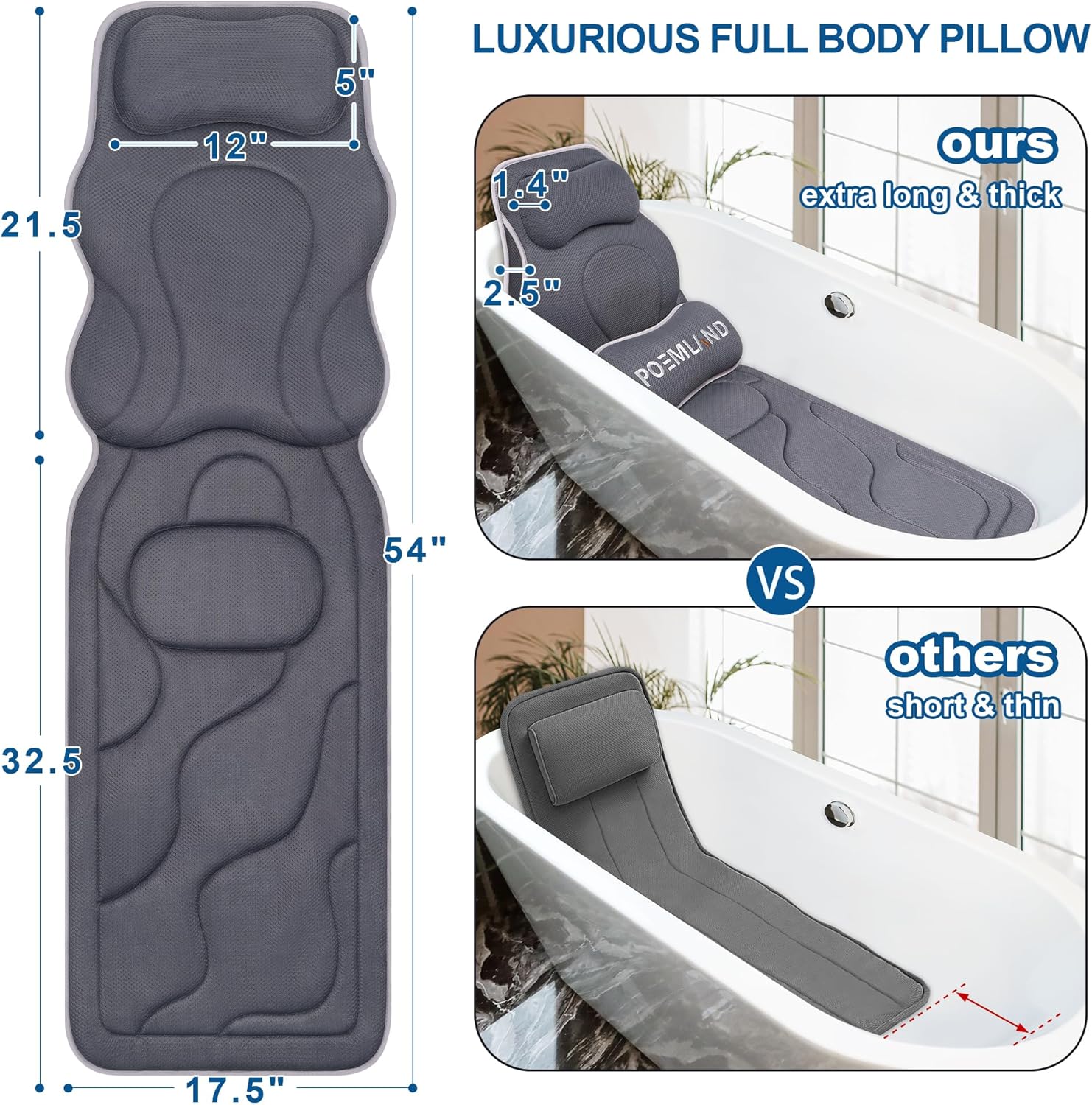 ["【Larger Size for Enhanced Comfort】 Our upgraded pillow measures 54*17.5*2.5 inches ensuring maximum bathing comfort for men women seniors and plus-size individuals. The longer size covers the entire bottom of the bathtub fit on any bathtub whether its a standard freestanding Jacuzzi or garden tub." 【Upgraded 6D mesh material】 Our pillow features newly upgraded 6D mesh material that uses the latest composite material technologycombining soft skin-friendly breathable supportable quick-drying and anti-slip features allowing you to experience the ultimate comfortable and safe bathing experience. 【Ergonomic Design for Optimal Support】 Our pillow uses a 12*5 inch wide neck support 2.5 inch thickened 3D back support and an 15*7*3.2 inch enlarged independent lumbar pillow support providing perfect wrapping for your upper body and sufficient support for your coccyx relieving fatigue and discomfort. 【Exclusive Silicone Anti-Slip Coating】 The back of the bathtub pillow features 12 powerful suction cups and a unique silicone anti-slip coating ensuring a secure fit on any bathtub surface whether it is a smooth or frosted bathtub surface. 【Easy Care and Maintenance】 Cleaning is a breeze! Simply machine wash the pillow in the included laundry bag and hang it to air dry using the 2 convenient hooks. This reduces bathroom clutter and keeps your pillow fresh and clean. 【The Perfect Gift for Bath Lovers】 Treat yourself or a loved one to the ultimate bathing experience. If you have any questions our dedicated customer service team is here to help.]