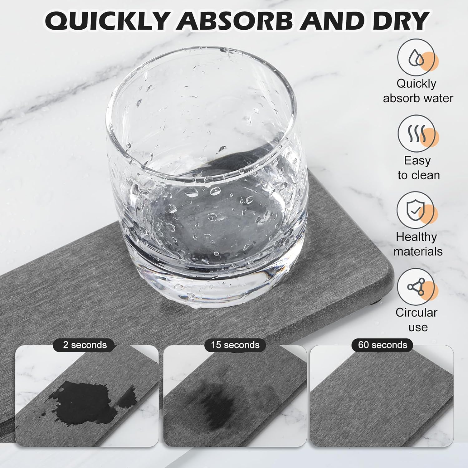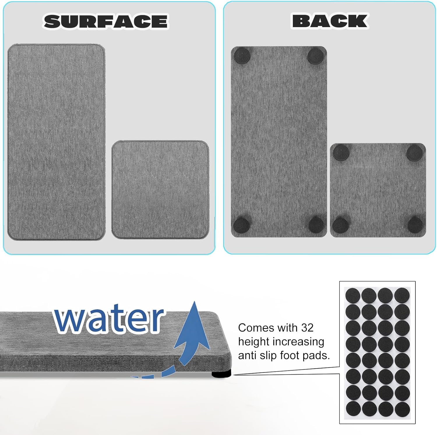[Quick Water Absorption and Fast Drying --- Our fast drying stone sink tray is made from natural diatom mud and plant fibersthe small pores in diatomaceous earth give it amazing water absorption.They can absorb water and dry out in a few minutes.This water absorbing stone makes the bathroom countertop more dry and tidy. Elegant Design & Multi-use --- In addition to its incredible water absorption functionour stone soap tray is also the perfect decor for home adding a touch of order and elegance to your living space.You can use the water absorbing stone tray for sink as hand soap dishbar coastersdish washing sponges traysmakeup bottles coasterscosmetic bottles soap bottles trayor anywhere you need to quickly absorb water and keep the surface of the countertop dry. More Anti Slip and Ventilated --- The silicone footpads boost the slip-resistance of stone drying tray while keeping them out of the bathroom vanity.This design improves the contact surface between fast drying stone sink tray and air accelerates the evaporation of waterand extends the service life of the water absorbing stone. Upgraded Design & More Textured --- The edges of the stone drying tray are ground and polished will not cutting hands and providing a good visual and tactile experience. At the same timethe upgrade of details and materials makes the vanity tray more textured. Perfect Size & Set of 4 --- Our water absorbent diatomite tray packaging Includes: 2 pieces coasters of 7 inches * 3.5 inches * 0.5 inches; 2 pieces coasters of 3.5 inches * 3.5 inches * 0.5 inches; 32 silicone anti slip pads; 2 pieces of sandpapers. They can meet your different needs.]